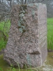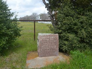 Coordinates: 31.076820, -96.002642 Location: Highway OSR, west of Interstate 45 Relation to Road: 20 ft from north stripe, facing road, SE 140° Distance from post: At post Dimensions: 35" x 29" x 14" Setting: Concrete and planted shrubs Other Markers/Signage: Yes Visibility: High Accessibility: Good This marker is on State Highway OSR, known locally as County Line Road, 2.8 miles west of Interstate Highway 45. It is about 300 feet west of County Road 405. There is a large stone ranch entrance across the road. The marker is at its original location. The marker is in front of a pasture fence, nestled among some planted crepe myrtle trees and shrubs in a shoulder of tall grass. The marker and plants are surrounded by a rectangular concrete border, which is mostly overgrown. Because of the plants, the marker itself is difficult to spot from the highway, but there is a brown historical marker sign across the street, making the site easy to find. There are no other historical markers at the site. A few feet down the road from the marker, the shoulder widens just a bit, allowing barely enough room to park a vehicle. The top of the marker slopes prominently from right to left. Observed on March 22, 2014. |