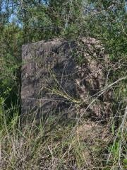 Coordinates: 28.916013, -98.596652 Location: SH 97 west of Jourdanton Relation to Road: 37 feet from south stripe, facing road, NW 320° Distance from post: 1.0 mi southwest of post, off route Dimensions: 36" x 25" x 15" Setting: Dirt, weeds, and brush Other Markers/Signage: No Visibility: Low Accessibility: Good This marker is on State Highway 97 west of Jourdanton. It is 0.5 miles west of Highway 97's intersection with Spur 162. It is on the south side of the road, on the right-of-way in front of a pasture full of mesquite trees. There is adequate room to park on the grass. The area is overgrown with weeds and brush, obscuring the marker's visibility. The marker is in good condition. A ground probe indicates that there is a layer of concrete a few inches beneath the topsoil. This marker was originally placed 1 mile northeast of here, on the part of the highway called Spur 162. When Zively surveyed the Old San Antonio Road in 1915, the state highways did not exist. Instead, the San Antonio, Uvalde, and Gulf Railroad was at this location. Zively placed the survey post for the marker where the Old San Antonio Road crossed the railroad north-to-south. Highway 97 and Spur 162 were subsequently built just north of the railroad, and then later, the railroad tracks were removed. Zively noted that Marker #94's survey post was 6.25 miles from the town of Charlotte, but the post was actually 8.6 miles from Charlotte. Observed on March 28, 2015. |